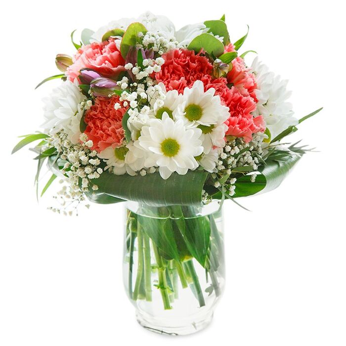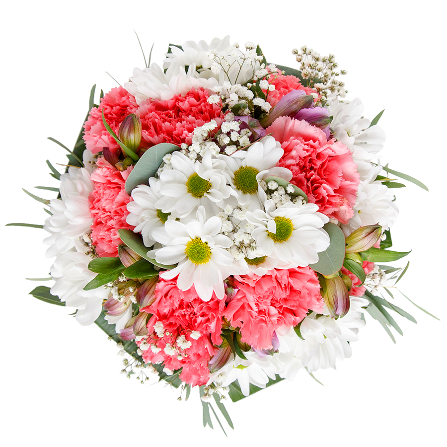 Embrace tranquility and elegance with our serene blossom ensemble. This artfully arranged bouquet combines the purity of white chrysanthemums, the delicate texture of gypsophila, and the gentle blush of light pink carnations, all tastefully accented by aspidistra leaves. Each flower is carefully hand-selected for its quality, ensuring that your arrangement radiates freshness and sophistication.